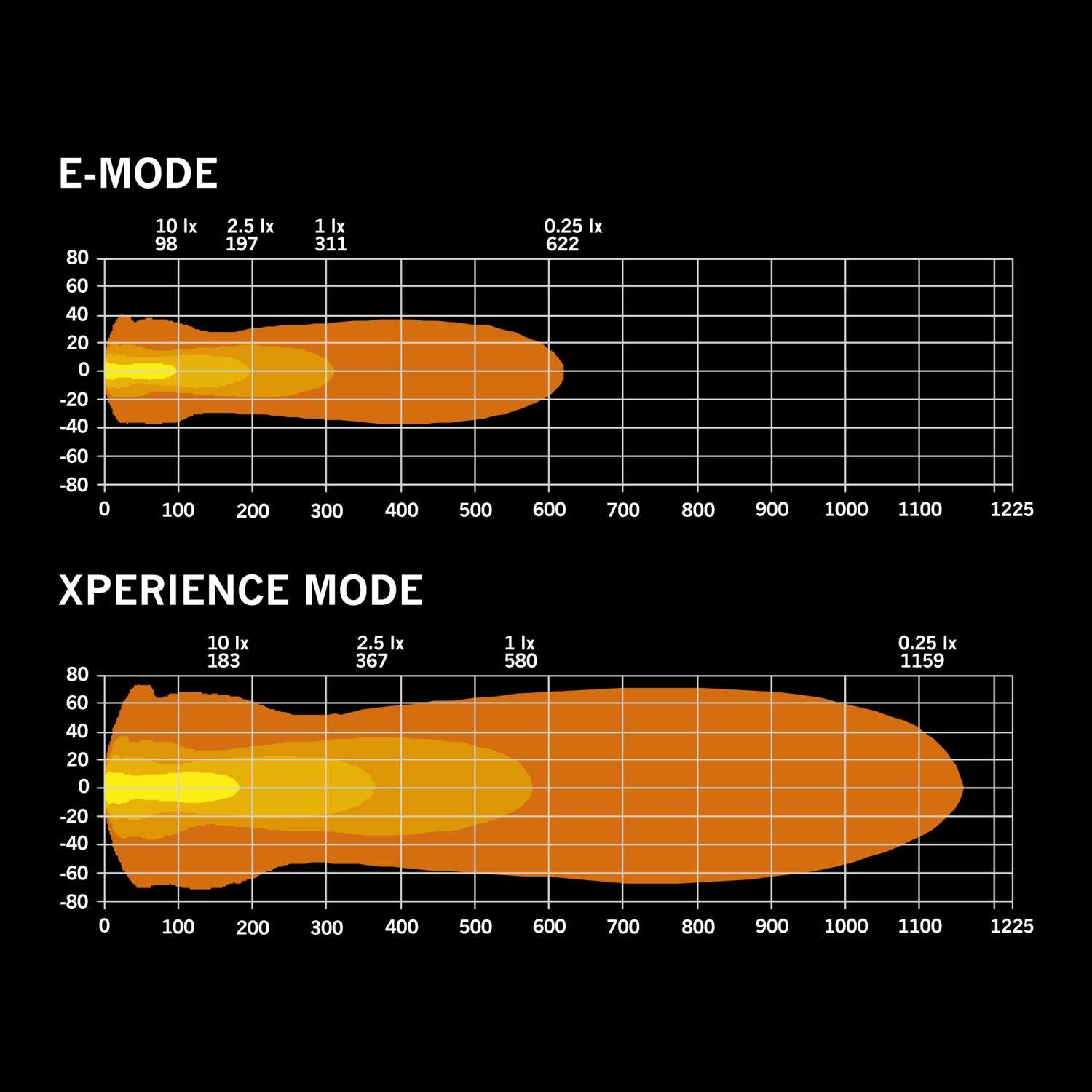 1 LUX @ E-mode: 311m / Xperience mode: 580mm