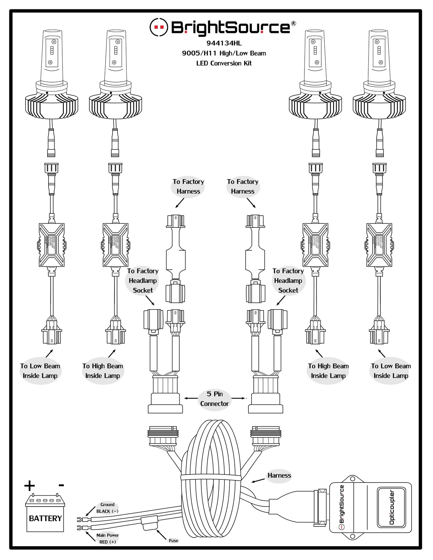 This conversion kit includes H11 Low and 9005 High beam bulbs with an Opticoupler, and all necessary components